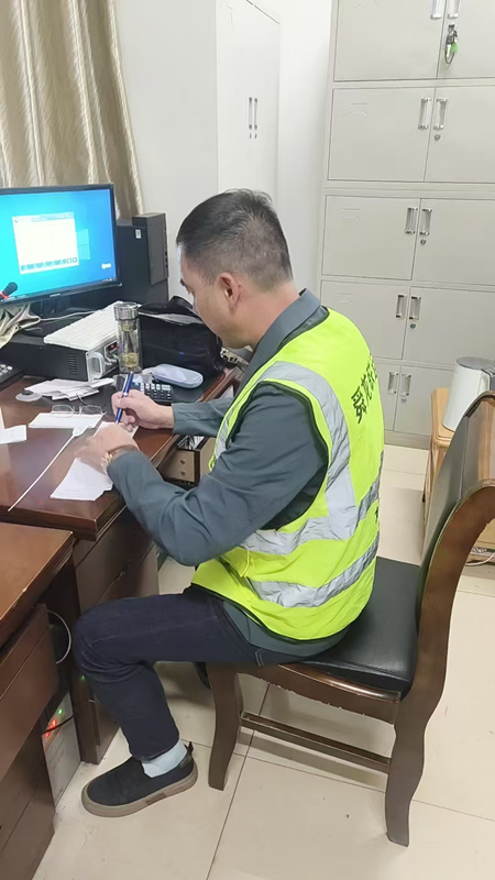圖為:方蔡軍在朱集西記錄車輛過(guò)磅,認(rèn)真記錄每車煤炭重量數(shù)據(jù)。