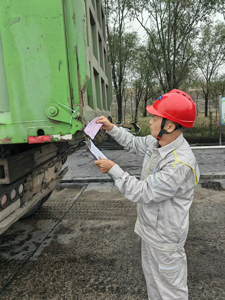 圖為:郭慶賀在鵬源碼頭核對(duì)車輛鉛封,嚴(yán)把煤炭數(shù)質(zhì)量關(guān)。